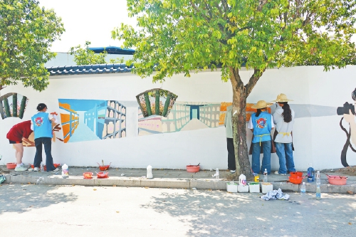 有了活动,怎样才能吸引更多游客前来体验?陈水光意识到必须从村容村貌入手,一点一滴营造出菌菇文化氛围。改变,就从老旧墙面开始。面对专业墙绘团队的高昂报价,他灵机一动,将目光投向了高校资源。通过积极对接,陈水光迅速与乐玩web版登录入口达成合作,邀请大学生实践队为村庄“美容”。