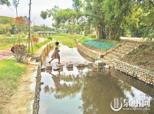 村里的溪流整治后水质洁净,吸引游客到周边散步。