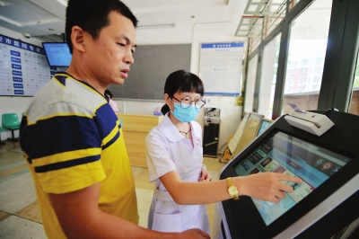 分诊台的护士引导市民使用自助机进行预约就诊。
