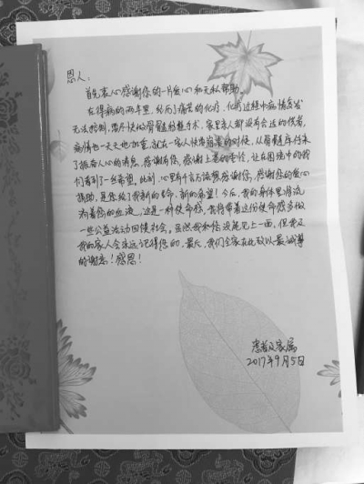 从信的内容来看,受捐者是两年前被确诊为白血病患者,然而其亲人当中找不到合适的配型,只能依靠化疗;化疗对身体伤害很大,而且病情几经反复。就在这一家人快要崩溃的时候,骨髓库找到了合适的配型,且当事人林金纶也表示愿意捐献。但因为捐赠者和受助者都不能知道对方身份的规定,不能当面说一声感谢,便选择用写信的方式来表达对他的感谢和祝福。