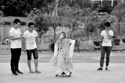 “首先,‘创小新’以京剧花旦形象示人,从结构上来看,因为技术原因,我们没有给它做脚,用车轮底盘实现行走。”刘钢说,再用手机蓝牙软件来控制它进行前进、后退、旋转。