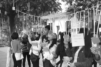 在学生社区门口,2012级广告学专业学生开展“感恩节送拥抱”活动,并装扮成“米奇”、“米妮”的卡通人物形象,与过往的老师同学拥抱,拉近彼此距离。英语俱乐部的同学精心布置多棵感恩树,在上面写满感恩寄语,并为各位老师送上亲手制作的感恩贺卡。在实验室里,2013级应用化学专业学生利用自身专业知识,自制“树叶书签”,粘贴在手工制作的贺卡上,为50余名老师送上祝福。在综合楼前,同学们把蜡烛摆放成“感恩之心”4个字的形状,并齐唱《感恩的心》,表达对父母、学校、老师的感恩之情。