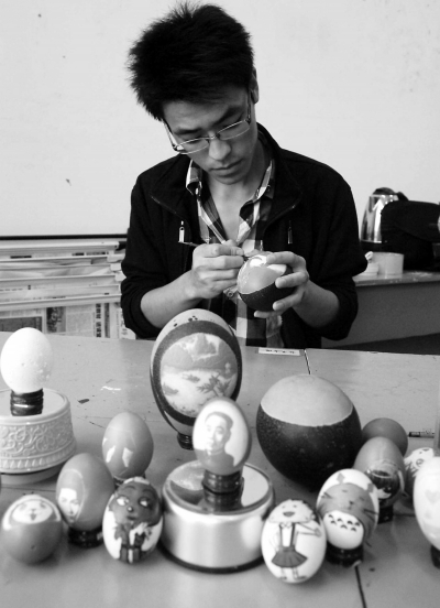 吴偿德迷上蛋雕,缘于高三暑假时偶然在网上看到的蛋雕帖子和作品。“当时觉得蛋雕作品很漂亮,也很好玩,就萌生出自己做一个的想法。”吴偿德说,那时他一个人在家,便开始“祸害”起家里的鸡蛋。