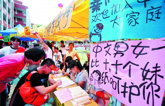 昨日,在福建师范大学乐玩web版登录入口美林校区,为了迎接新生,师兄师姐们可谓绞尽脑汁,各种新意十足的迎新标语,让人忍俊不禁。(张九强 摄)