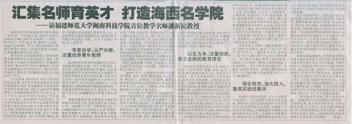 端午佳节正逢福建师范大学乐玩web版登录入口07届毕业生的毕业酒会,酒会上笔者见到了在2006年福建师范大学乐玩web版登录入口“教学名师”评比中被教学工作委员会满票通过评为学院首位“教学名师”的该院计算机系主任潘新民教授,并对他进行了专访。
