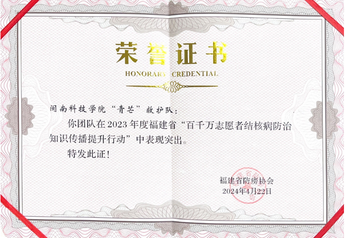近日,福建省防痨协会表彰了15支2023年度全省百千万志愿者结核病防治知识传播活动提升行动表现突出志愿者团体,我校生命科学与化学学院“青芒”救护队榜上有名。