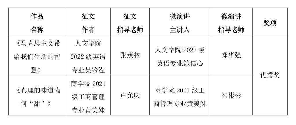 近日,由中共福建省委教育工委主办的“马克思主义能给予我们什么”第七届全省高校大学生主题征文和微演讲活动公布获奖名单,我校选送的作品《马克思主义带给我们生活的智慧》、《真理的味道为何“甜”》分别获本科生组优秀奖。
