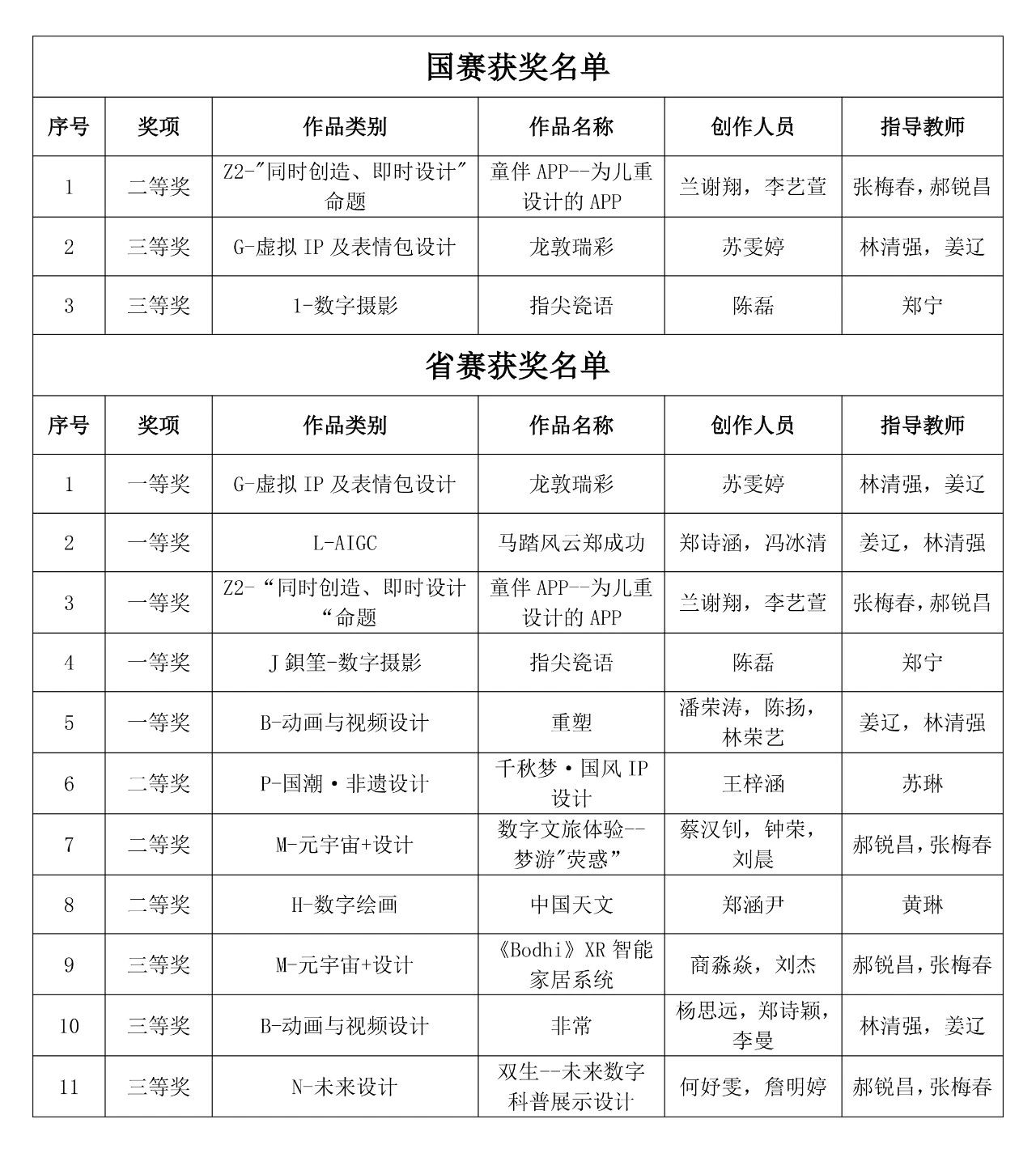 近日,由工信部人才交流中心主办的2024年第十二届未来设计师·全国高校数字艺术设计大赛(NCDA)公布获奖名单,我校艺术设计学院学子取得全国总决赛二等奖1项,三等奖2项;福建省赛区一等奖5项,二等奖3项,三等奖3项的好成绩。