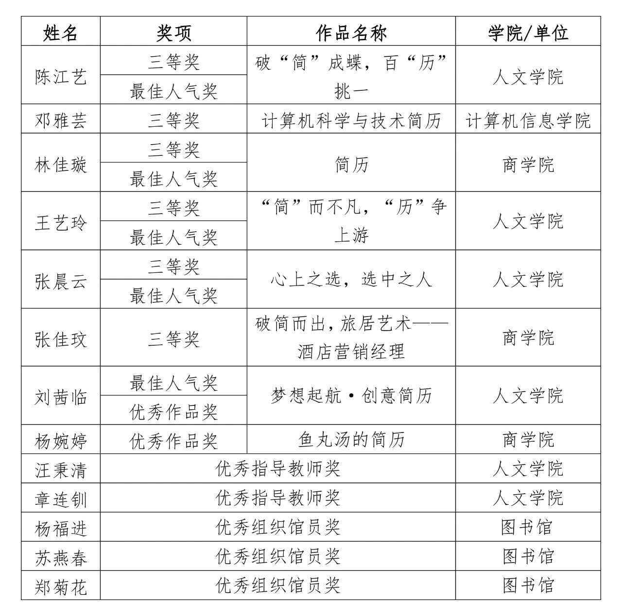近日,2024年泉州市就业简历创意设计大赛公布获奖名单,我校师生获大赛三等奖6项、优秀作品奖2项、最佳人气奖5项、优秀指导教师奖4项、优秀组织馆员奖3项,校图书馆获大赛优秀组织奖。