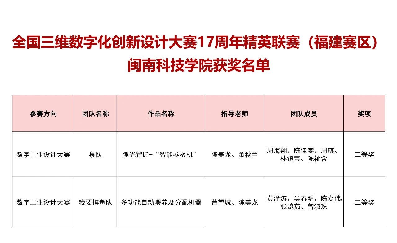 近日,全国三维数字化创新设计大赛17周年精英联赛(福建赛区)成绩公布,我校计算机信息学院参赛队伍“泉队”与“我要摸鱼队”分别获得省赛二等奖。