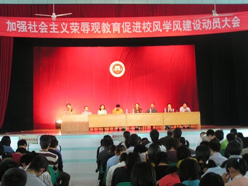 为与党中央路线保持一致,4月19日,学院召开加强社会主义荣辱观教育促进校风学风建设动员大会,院领导、学院法人代表戴宽南先生及全院师生参加了大会。黄国盛院长在会上作了关于“八荣八耻”和校风学风建设的报告。戴宽南先生代表董事会在会上发表关于荣辱观教育及校园建设情况的讲话,宣布了2006年下半年乐玩web版登录入口将隆重举行5周年校庆。最后,戴宽南先生希望同学们努力学习,将来成为社会主义建设有用的人才。黄国盛院长的报告及戴宽南先生的讲话使师生们受到深刻的教育和极大的鼓舞。