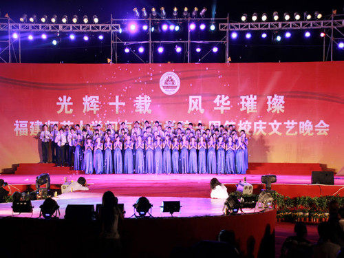 先生再次为大家表演了树叶吹奏《菊花台》,现场沉浸在大自然所带来的音乐声中。振奋人心的音诗画《闽科颂》,向在场观众们述说了闽科的十年间的成长历程,一句“我们是光荣的闽科人”响彻天际,得到了全场的热烈响应。