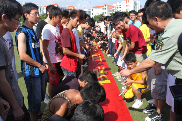 上午,“福建师范大学乐玩web版登录入口2011年度兵役登记(试点)现场会”、“南安市2011年度征兵宣传动员暨千名适龄青年应征签名大会”在我院田径场如期隆重举行。活动在福建省军区、泉州军分区的统一部署下,为进一步提高兵役登记的普及率和有效性,不断创新高校国防教育方式,广泛开展征兵宣传发动工作,为年度征兵工作奠定坚实基础的一项重要举措,由南安市人民武装部和乐玩web版登录入口人民武装部共同举办。据悉:我院是福建省军区和泉州市军分区在南安开展兵役登记试点的三个重点单位之一,亦是本年度全省唯一一所举办兵役登记(试点)现场会和征兵宣传动员大会的高校。