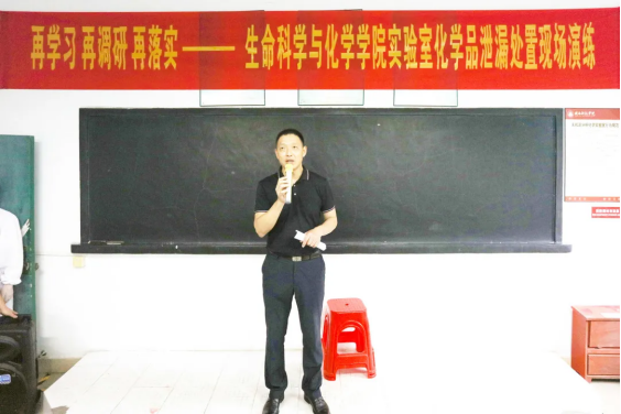 6月2日下午,我校在求真楼开展实验室化学品泄漏处置现场演练。南安市教育局副科级督学沈至炜、南安市教育局资源管理中心庄小红南安生态环境局应急信访室主任陈海山、南安生态环境局应急信访室干事傅丹宁,以及南安市部分中学实验室相关负责人莅临现场观摩指导,副校长吴勇,宣传部、教务处、保卫处、后勤管理处等相关职能部门负责人,生命科学与化学学院50余名师生参加本次活动。
