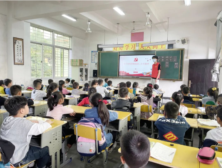 随后,大学生宣讲小分队来到壶南小学,把党的二十大精神与日常学习生活中的所见所闻所思相结合,围绕传承红色基因、传承理想信念、争做时代新人等方面,为二年级近50名小学生上了一堂接地气、有朝气的思政课。