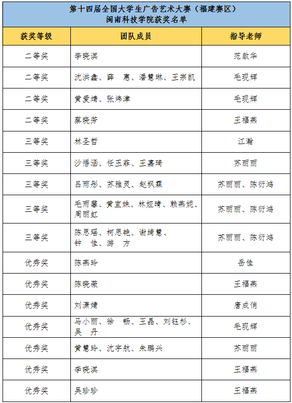 在2022年第十四届全国大学生广告艺术大赛福建赛区比赛中,我校学子斩获佳绩,获得16个省级奖项,包括二等奖4项、三等奖5项、优秀奖7项。