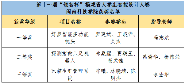 在第十一届“锐智杯”福建省大学生智能设计大赛中,我校师生发扬团队精神,努力拼搏,经过激烈角逐,共获省级一等奖1项、二等奖1项、三等奖1项。