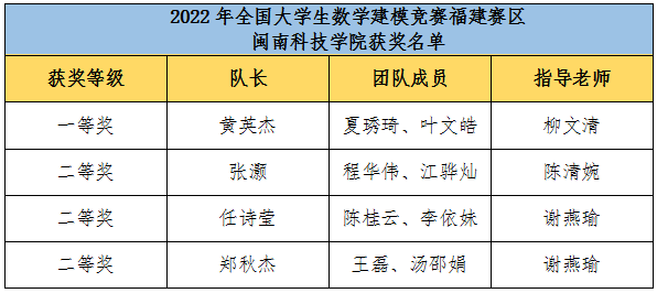 在2022年全国大学生数学建模竞赛(福建赛区)中,我校学子共获一等奖1项、二等奖3项。备赛期间,数学建模教师组的所有指导教师悉心指导,同学们刻苦钻研,不断提高创新能力和综合素质,并取得佳绩。