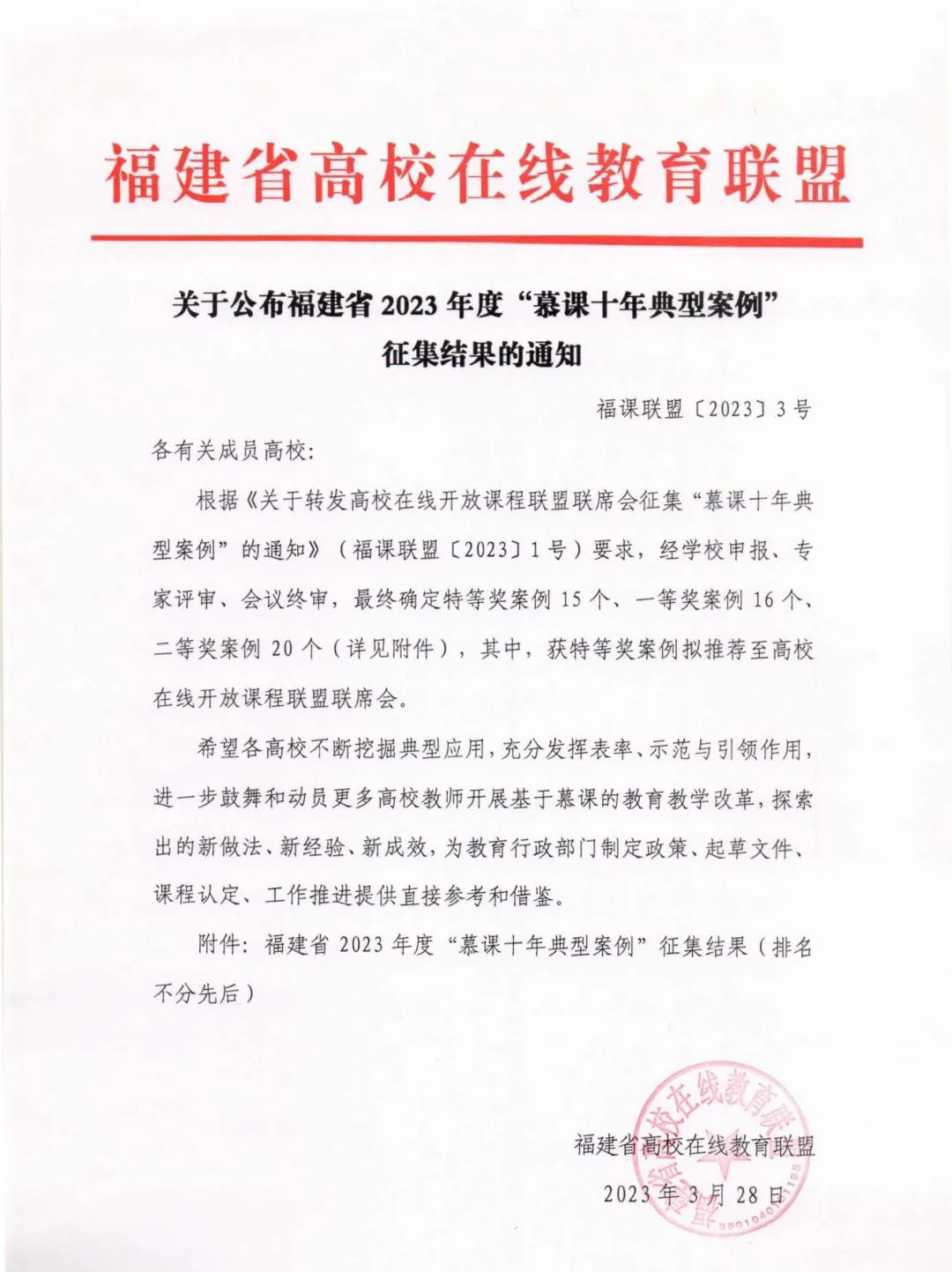 2023年度“慕课十年典型案例”由福建省高校在线教育联盟发起,围绕教育数字化战略行动、聚焦慕课领域征集典型案例。下一阶段,学校将以此为契机不断挖掘典型应用,充分发挥表率、示范与引领作用,进一步鼓舞和动员更多教师开展基于慕课的教育教学改革,探索出的新做法、新经验、新成效,不断提升课程建设质量。