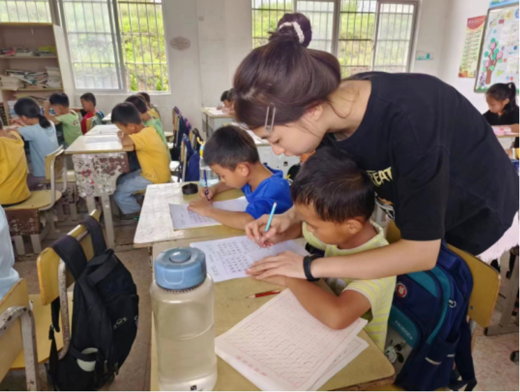 在书法课程上,实践队从基本的书写姿势、握笔、运笔开始进行教学,一一纠正了孩子们在书写过程中的错误姿势。期间,还细致讲述了中国汉字的演变过程,增进孩子们对书法艺术魅力的了解。