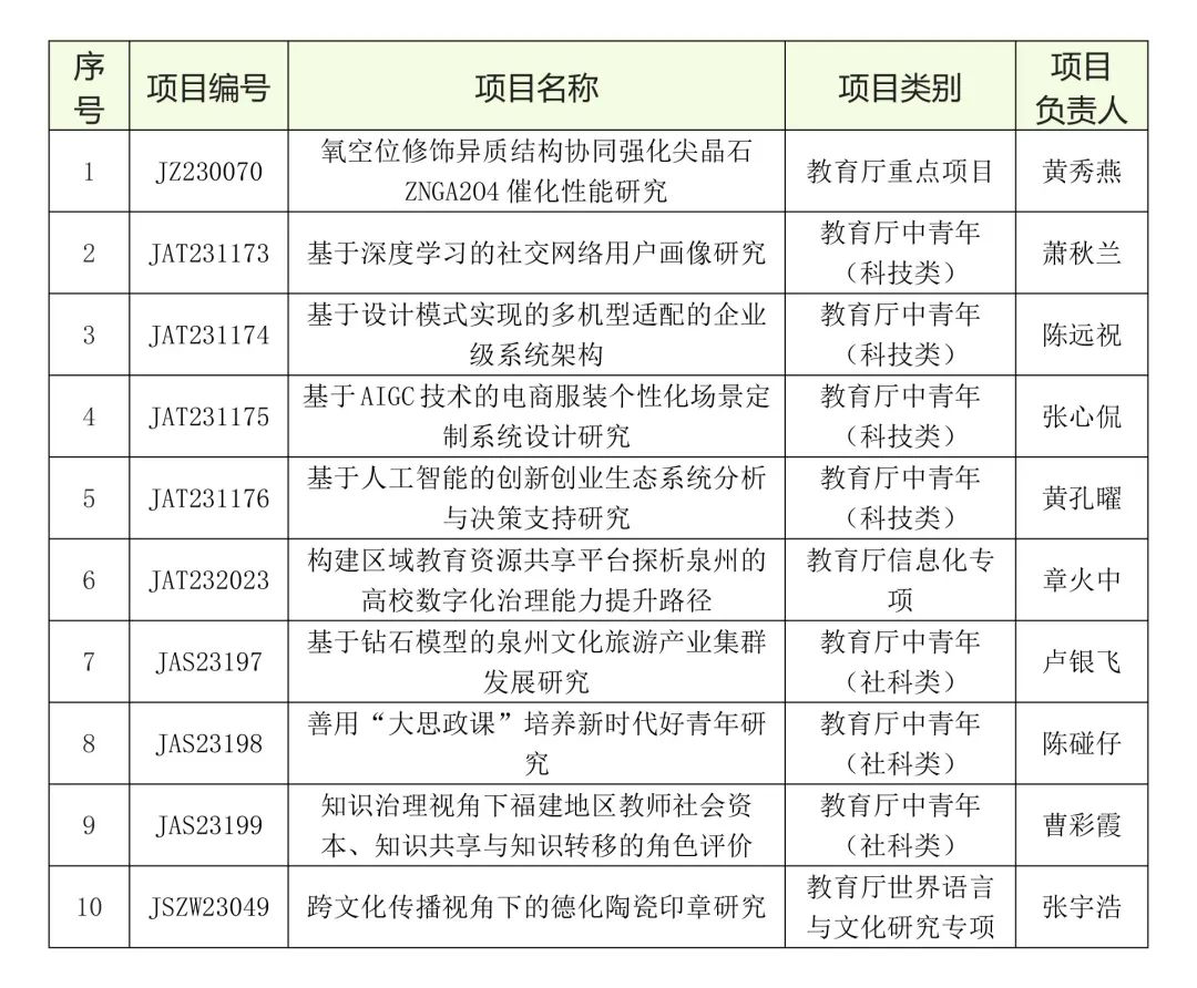 近日,福建省教育厅公布了2023年度福建省教育系统哲学社会科学研究有关项目立项名单、2023年度福建省中青年教师教育科研项目(科技类)立项名单,我校共有10项课题获批立项。