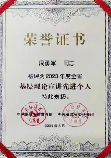 近日,中共福建省委宣传部、省委讲师团联合印发《关于表扬全省基层理论宣讲先进集体、先进个人和优秀理论宣讲报告、微视频的通报》,我校常务副校长、纪委书记(副研究员)周勇军获评2023年度全省“基层理论宣讲先进个人”。